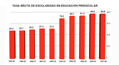 Também cresceu muito o número de cresces públicas como se pode ver pelo aumento da taxa de escolaridade pre-escolar das crianças venezuelanas, como se assinala no gráfico abaixo.