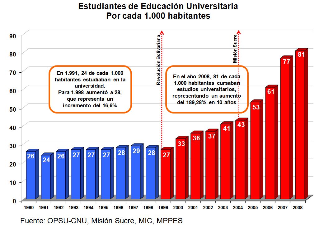 É preciso ter em mente que todas estas missões educativas são acrescentos às escolas, universidades e institutos de formação públicos já existentes, ou seja, trata-se de alunos e formandos adicionais. Para explicar isto melhor chamo a atenção para os gráficos que se seguem que mostram o crescimento de estudantes universitários na Venezuela.